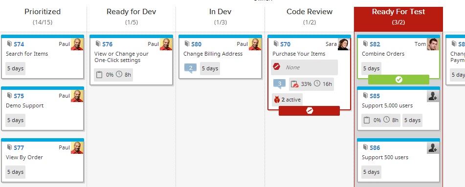 A result of using these “Ready For x” columns is that they tend to slightly move us away from the “stop the line” practice that good Lean/Kanban systems employ. Basically whenever there’s a problem, or a bottleneck is appearing, we want to stop the production line and address the issue. So, if we keep all these “Ready for QA” cards in our In Dev or Code Review Column (basically whatever column comes before your Ready for QA column) then we’ll very quickly reach our WIP (Work In Progress) limit and the line will be stopped. That’s a good thing! We want to catch that bottleneck as soon as we can, we don’t want to hide it by pushing our cards into another “buffer” column.