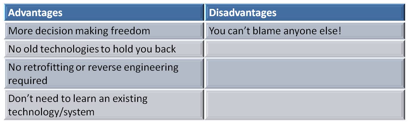 The “warts and all” title was meant to be a caveat that they don’t claim to have got everything perfectly right, and that there were problems along the way on this project. The client for this particular project was “Springer” (a publishing company) and the job was to redesign the website (basically). One of the problems they were aiming to fix was the “time to release”, which was in the region of months, rather than hours, and so they decided to go all Continuous Delivery from the outset. Another thing worth mentioning was that this was a greenfield project, which has its advantages and disadvantages, as outlined here in my incredibly pointless table: